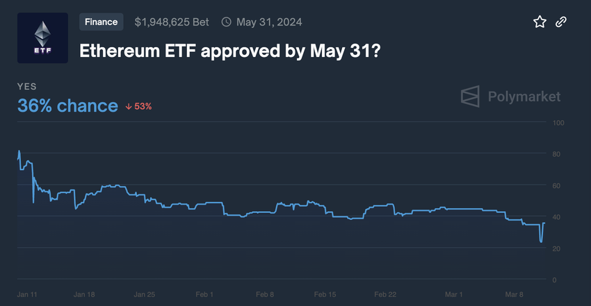 SponsoredTuttavia, questo ottimismo deve ora fare i conti con la realtà. La piattaforma di previsione Polymarket indica una probabilità del 36% di approvazione dell’Ethereum ETF. Vale la pena notare che prima, l’11 marzo, le probabilità erano scese al 24%.