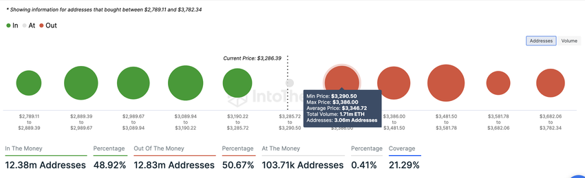 Tuttavia, un grande gruppo di indirizzi fuori dal denaro fornirà resistenza. Al momento della stampa, lo IOMAP mostra che 3,06 milioni di indirizzi hanno acquistato 1,71 milioni di ETH tra 3.290 e 3.386 dollari. Questo gruppo è fuori dal denaro.