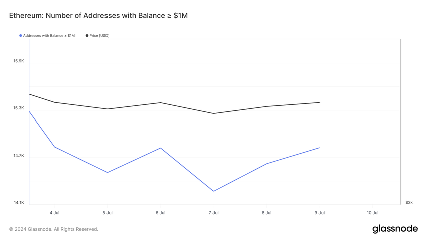 Il numero di indirizzi che detengono ETH per un valore di 1 milione di dollari o più dimostra questa azione. Il 7 luglio, questa metrica era di 14.217 unità. Tuttavia, al momento in cui scriviamo, la cifra è aumentata a 14.823, riflettendo una maggiore domanda di criptovaluta e l’ottimismo per l’approvazione dell’Ethereum ETF.