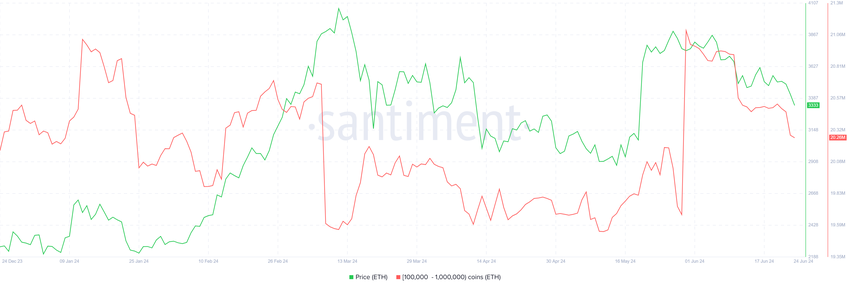 I whales tendono ad avere l’impatto maggiore su un asset, dato che hanno il portafoglio più grande. Nel caso dell’ETH, tuttavia, i whale non sembrano avere grandi speranze di guadagno. Gli indirizzi che detengono tra 100.000 e 1 milione di ETH hanno venduto quasi 700 milioni di ETH nelle ultime due settimane.