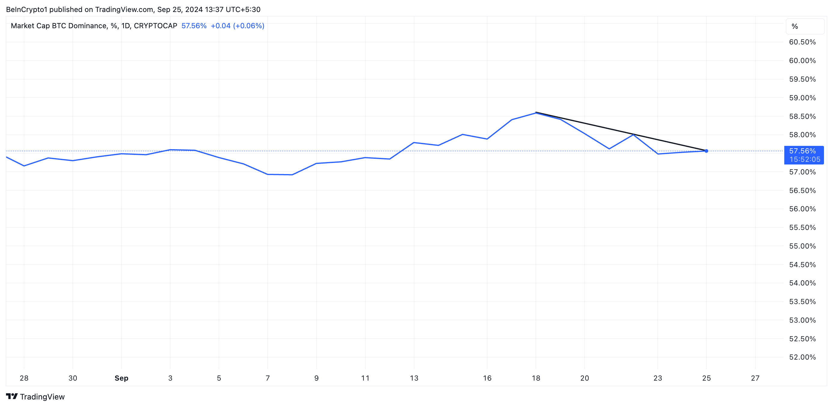 Questo picco nel rapporto ETH/BTC coincide con un calo del dominio di Bitcoin (BTC.D), che misura la capitalizzazione di mercato di Bitcoin come percentuale dell’intero mercato delle criptovalute. Attualmente al 57,56%, BTC.D è sceso dello 0,01% nell’ultima settimana. Un calo nel dominio di Bitcoin spesso indica un crescente interesse per le altcoin, come dimostra la tendenza al rialzo nel rapporto ETH/BTC.
