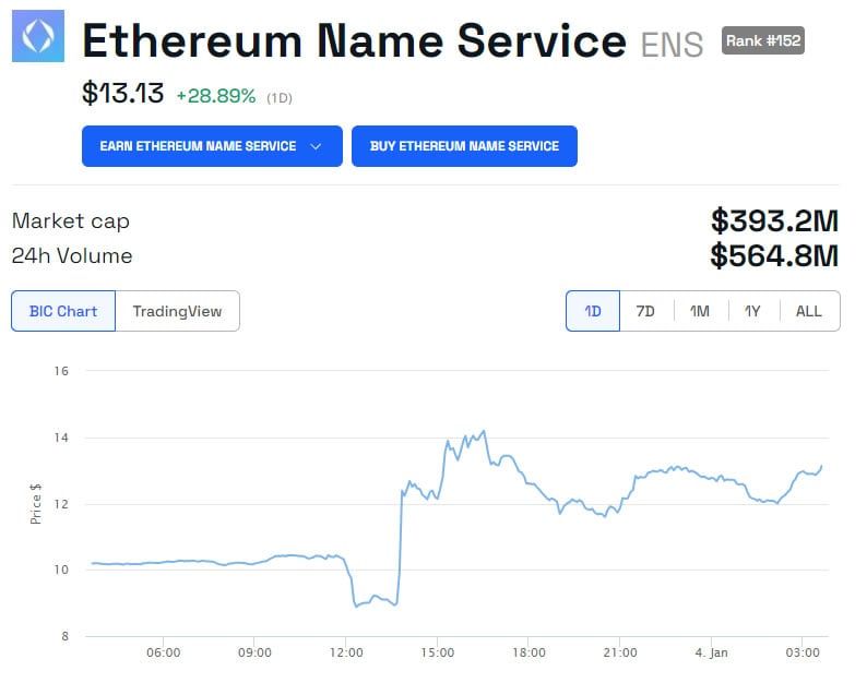 I suoi ultimi commenti hanno provocato un’impennata del 55% dei prezzi di ENS. Il token aveva iniziato a ritirarsi durante il crollo del mercato delle criptovalute, scendendo a 9 dollari negli ultimi scambi del 3 gennaio. Tuttavia, si è impennato a 14 dollari dopo i commenti e ha mantenuto i guadagni negli scambi asiatici del 4 gennaio.
