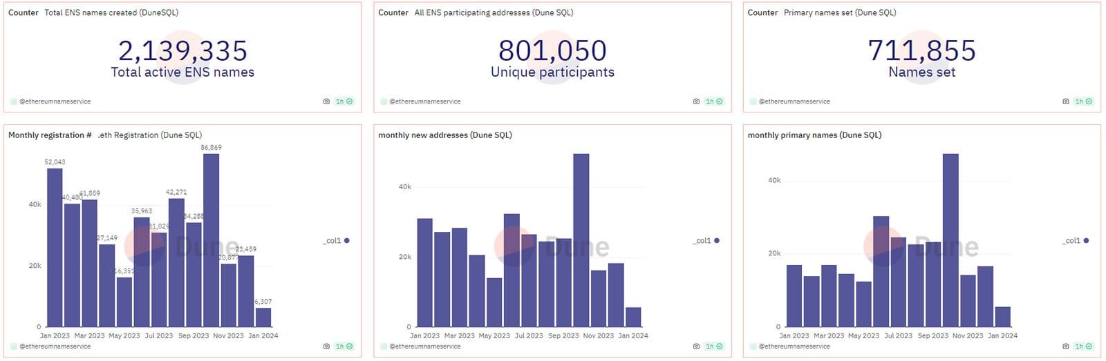 SponsoredAttualmente ci sono 2,1 milioni di domini ENS attivi, con 801.000 partecipanti unici, secondo Dune Analytics.