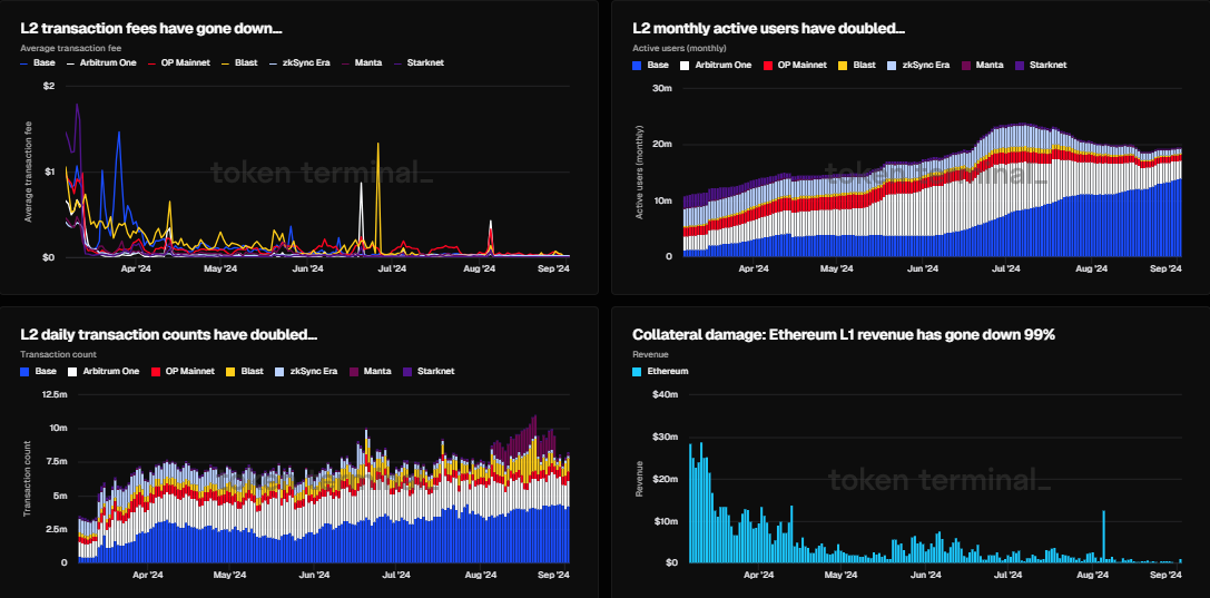 SponsoredLa crescente concorrenza tra oltre 70 soluzioni L2 attive e 21 progetti Layer-3 (L3) ha ulteriormente allontanato gli utenti dal mainnet di Ethereum, facendo crollare il reddito della rete di Ethereum da 35,5 milioni USD il 5 marzo a 566.000 USD alla fine di agosto.