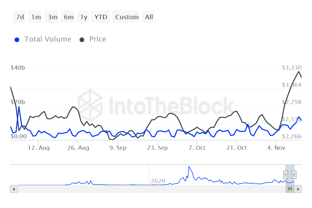 L’attività delle whale di Ethereum è aumentata, con un volume di transazioni che ha raggiunto oltre 13,8 miliardi di USD, un massimo di tre mesi. Questo aumento segnala un rinnovato interesse da parte dei detentori di grandi portafogli, un gruppo che influenza significativamente le tendenze dei prezzi di ETH. Tale partecipazione delle whale spesso porta a impennate a breve termine del valore di Ethereum, come visto nel recente rally.