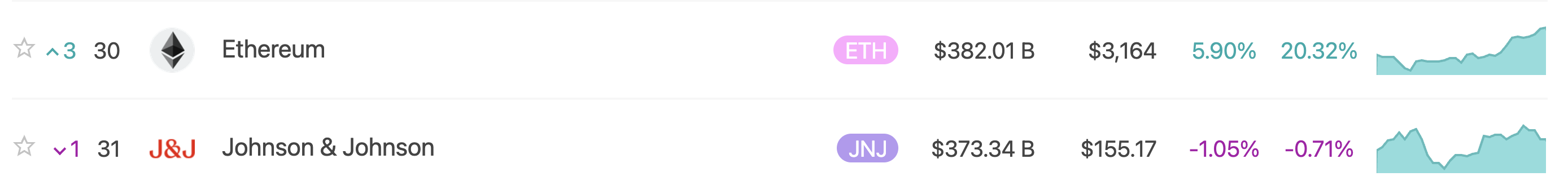 L’aumento del prezzo di ETH ha naturalmente incrementato la sua capitalizzazione di mercato, che è stata registrata intorno ai 382 miliardi di dollari. Con l’aumento del valore di mercato, ETH ha detronizzato Johnson & Johnson dalla 30ª posizione nella classifica globale degli asset.