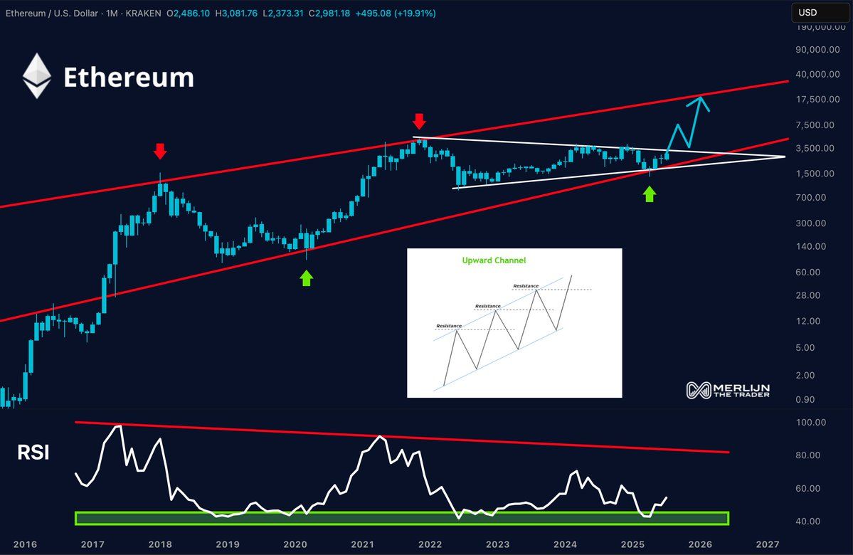 “Triplo rimbalzo RSI. Canale macro intatto. Il prezzo si è avvolto per mesi. Quando ETH esplode da qui…$5.000 è solo il riscaldamento,” ha affermato Merlijn.