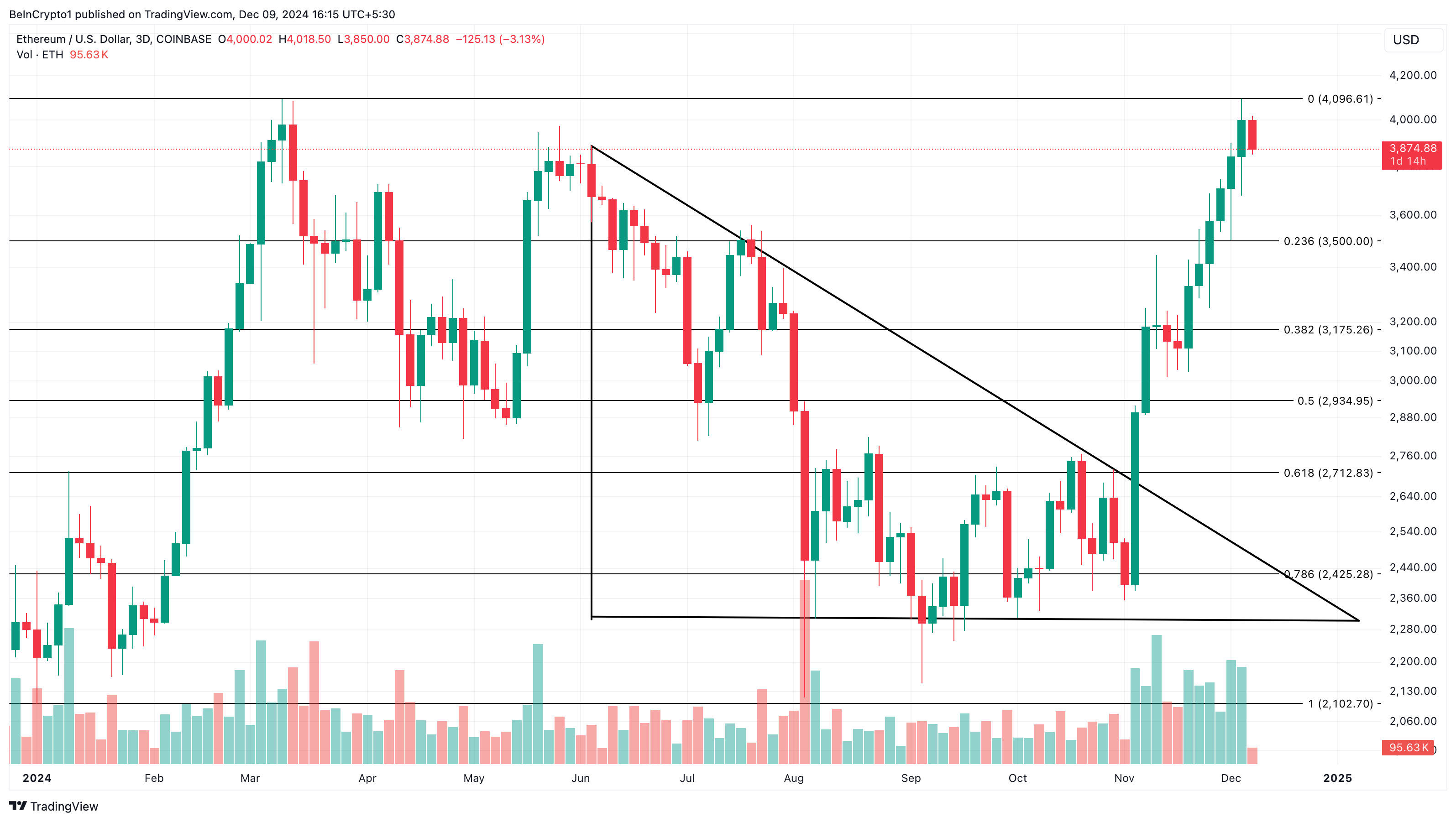 Il grafico ETH/USD a 3 giorni mostra che la criptovaluta ha scambiato all’interno di un triangolo discendente tra giugno e novembre. Un triangolo discendente è un pattern grafico ribassista comunemente riconosciuto, definito da una linea di tendenza discendente che collega una serie di massimi progressivamente più bassi e una linea di tendenza più piatta che si forma lungo un livello di prezzo costante, fungendo da supporto mentre il prezzo dell’asset lo testa più volte.