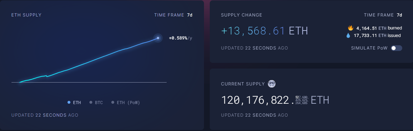 Con un tasso di inflazione dello 0,59% all’anno, la narrativa della “moneta ultra-sonora” sta diminuendo. In effetti, Ethereum sta attualmente emettendo più unità di quante ne brucia, contraddicendo la precedente narrativa deflazionistica.