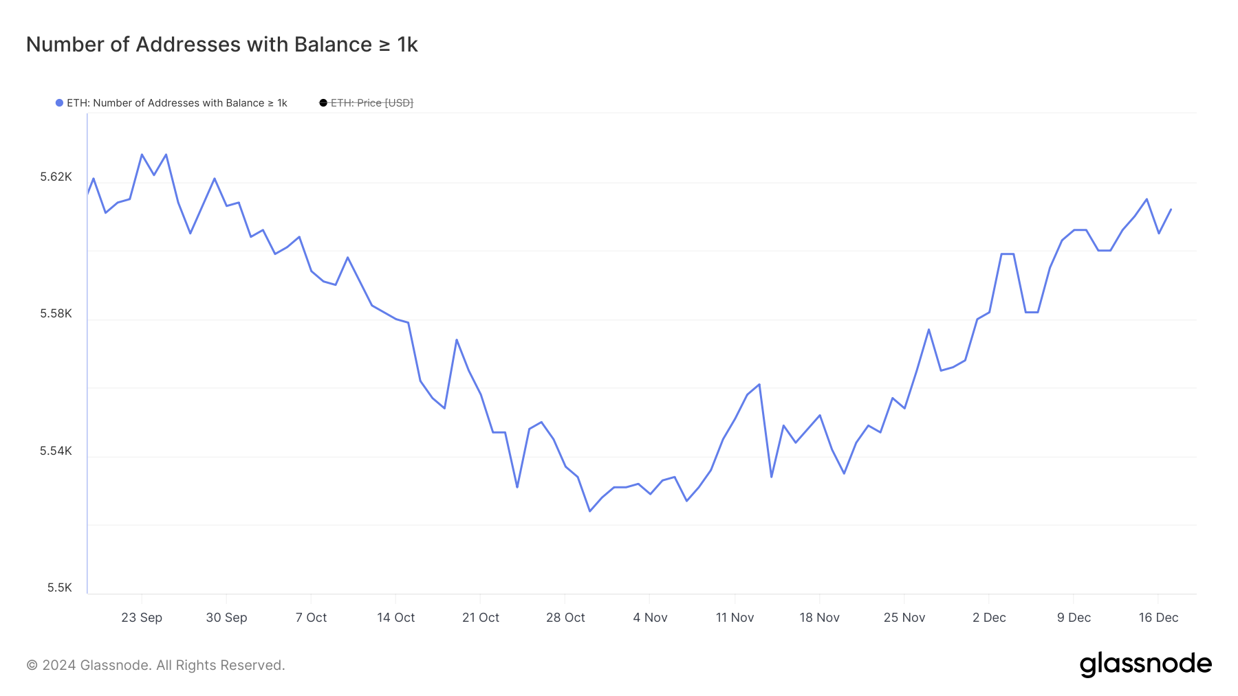 Il numero di indirizzi che detengono almeno 1.000 ETH è aumentato costantemente durante dicembre. Il 1° dicembre, c’erano 5.580 di tali indirizzi, in aumento rispetto al minimo di tre mesi di 5.524 del 30 ottobre.