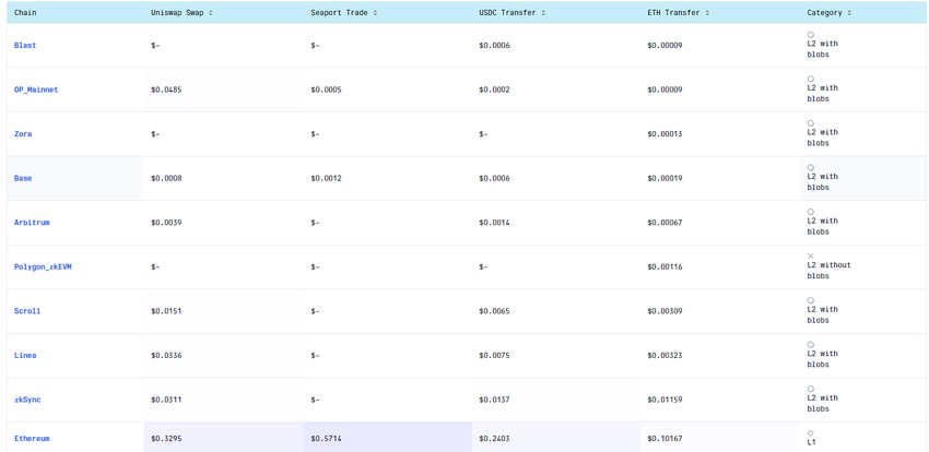 Questa riduzione delle commissioni si nota anche nelle soluzioni di scalatura del layer 2 di Ethereum. I dati di Gasfees.io indicano che le commissioni medie su Optimism, Base, Arbitrum e Linea sono attualmente inferiori a 0,01 dollari.