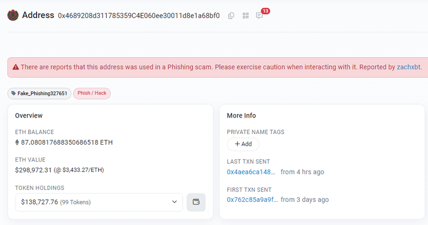 ZachXBT ha anche condiviso l’indirizzo del furto. Quando BeInCrypto ha provato a cercare i dati sulblockchain del portafoglio segnalato da ZachXBT, ha scoperto che contiene 87,08 Ethereum (ETH).