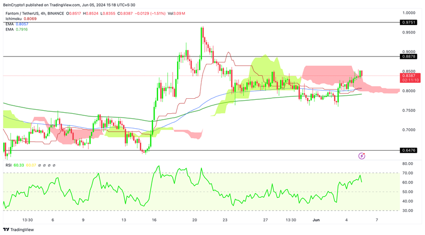 Se il prezzo dovesse superare il limite superiore della nuvola a 0,88 dollari, potrebbe spingersi verso 0,97 dollari. Tuttavia, FTM potrebbe testare il limite inferiore della nuvola se il prezzo dovesse invertire la rotta. Questa zona di supporto potrebbe fungere da ostacolo, ma una chiara rottura al di sotto di essa potrebbe far scendere il prezzo verso l’EMA a 100 giorni a 0,73 dollari.