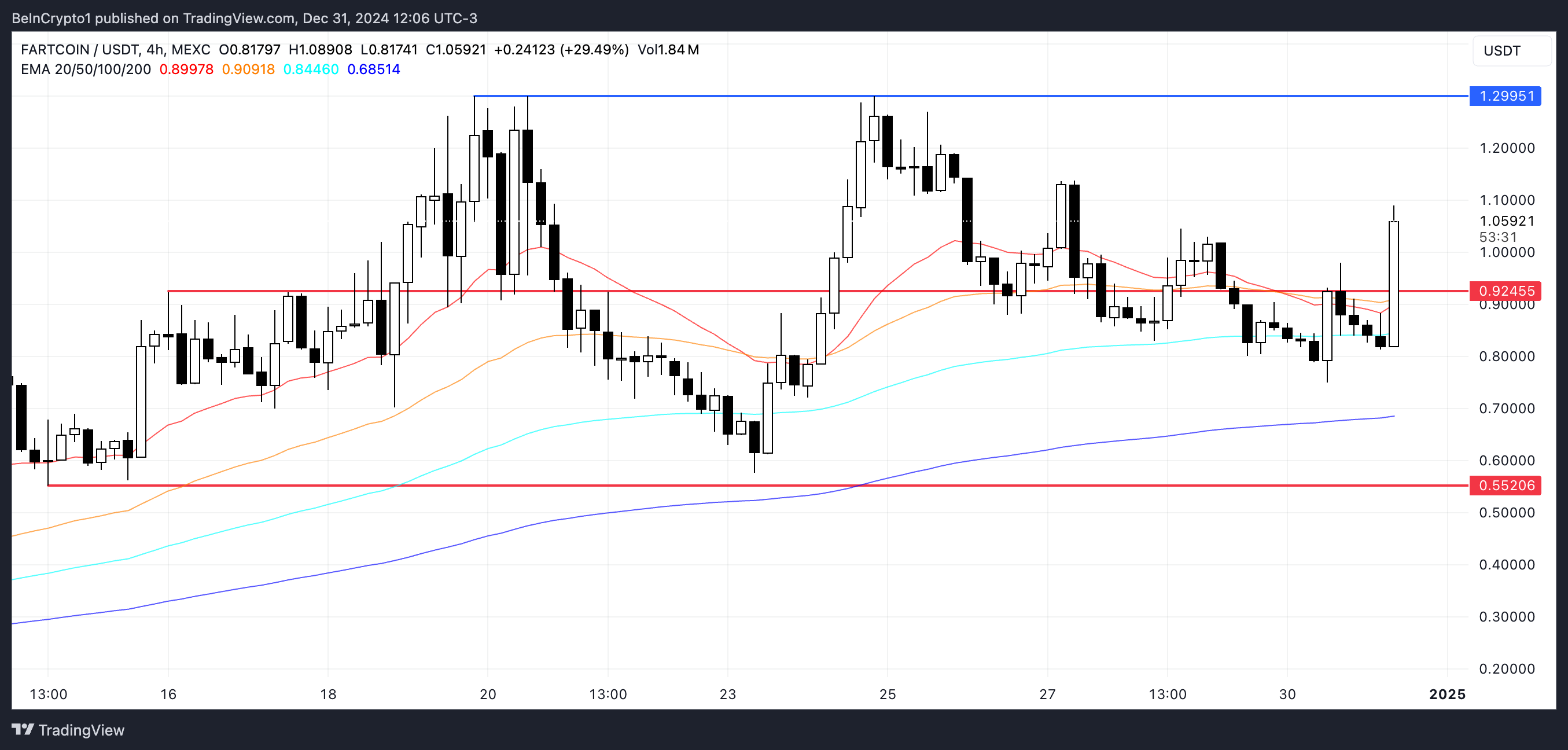 Se l’attuale trend rialzista persiste, il prezzo di FARTCOIN potrebbe salire per testare il livello di 1,29 USD, con il potenziale di spingersi più in alto verso 1,35 USD e persino 1,40 USD, raggiungendo nuovi massimi storici e facendo salire FARTCOIN nella classifica dei memecoin.