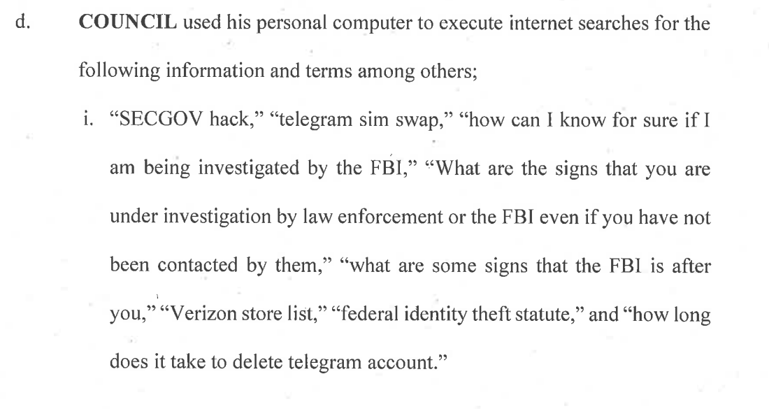 Nonostante la dichiarazione di non colpevolezza di Council, il governo federale afferma di avere prove sostanziali che collegano Council al crimine. L’atto d’accusa mostra che Council ha cercato informazioni online sul hack e controllato se fosse sotto indagine.