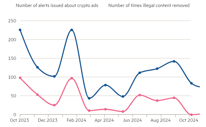 Secondo un rapporto del Financial Times, tra ottobre 2023 e ottobre 2024, solo il 54% dei 1.702 avvisi emessi dalla FCA ha portato alla rimozione di annunci crypto illegali. Le restanti promozioni rimangono attive.