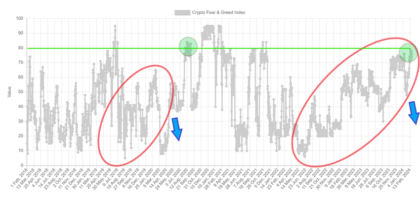 Il crollo del 2020 si è concluso con il ritorno del Fear and Greed Index in territorio di paura estrema, in prossimità di 10. Questo è accaduto 3 mesi prima che il Bitcoin venisse venduto. Questo avvenne 3 mesi prima del precedente dimezzamento del Bitcoin. Nelle condizioni attuali, a 2 mesi dal dimezzamento e con il mercato piuttosto caldo, la probabilità di una correzione più profonda (freccia blu) rimane alta.