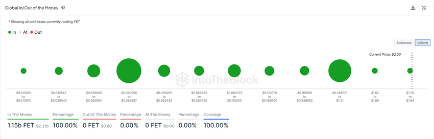 SponsoredSecondo l’indicatore Global In/Out of the Money (GIOM), il 100% dell’intera offerta circolante di FET sta fruttando guadagni ai suoi investitori. L’ultimo gruppo che ha raggiunto il profitto è una coorte che detiene 18.350 FET per un valore di 36.700 dollari, acquistati a una media di 1,82 dollari.