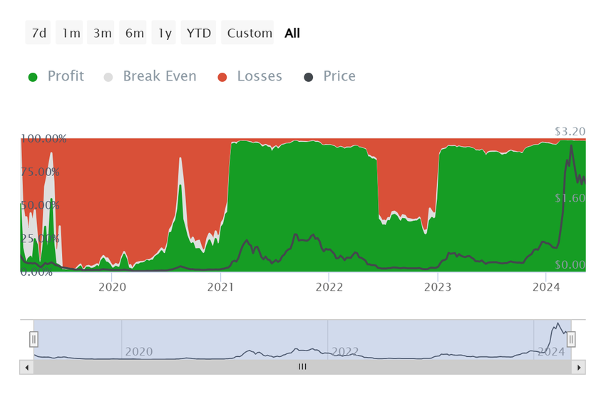Ciò è probabilmente dovuto alla saturazione dei profitti tra i detentori di FET. Secondo l’indicatore storico di pareggio, oltre il 97% dell’offerta è attualmente al di sopra del prezzo acquistato. Il restante 3% è diviso tra gli investitori che subiscono perdite, ovvero coloro che hanno acquistato a un prezzo più alto di tutti i tempi.