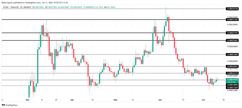 Ilprezzo di Floki a 0,0001497 dollari sta cercando di recuperare dopo aver trasformato la resistenza a 0,0001856 dollari in supporto. Questo è essenziale per il memecoin, in quanto permetterebbe un aumento a $0,0002000 e il recupero dei profitti persi.