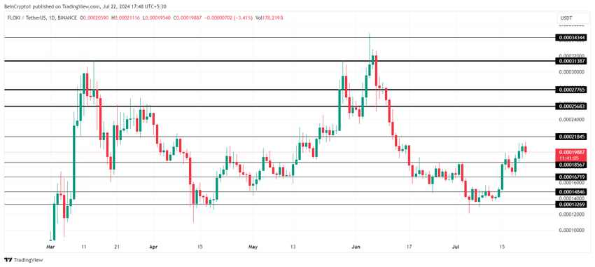 Ilprezzo di Floki a 0,0001988 dollari è ancora sotto la resistenza critica di 0,0002185 dollari. Anche se il recente rialzo sta sostenendo un ulteriore aumento del prezzo, il memecoin avrebbe bisogno di spunti più forti per farlo accadere.