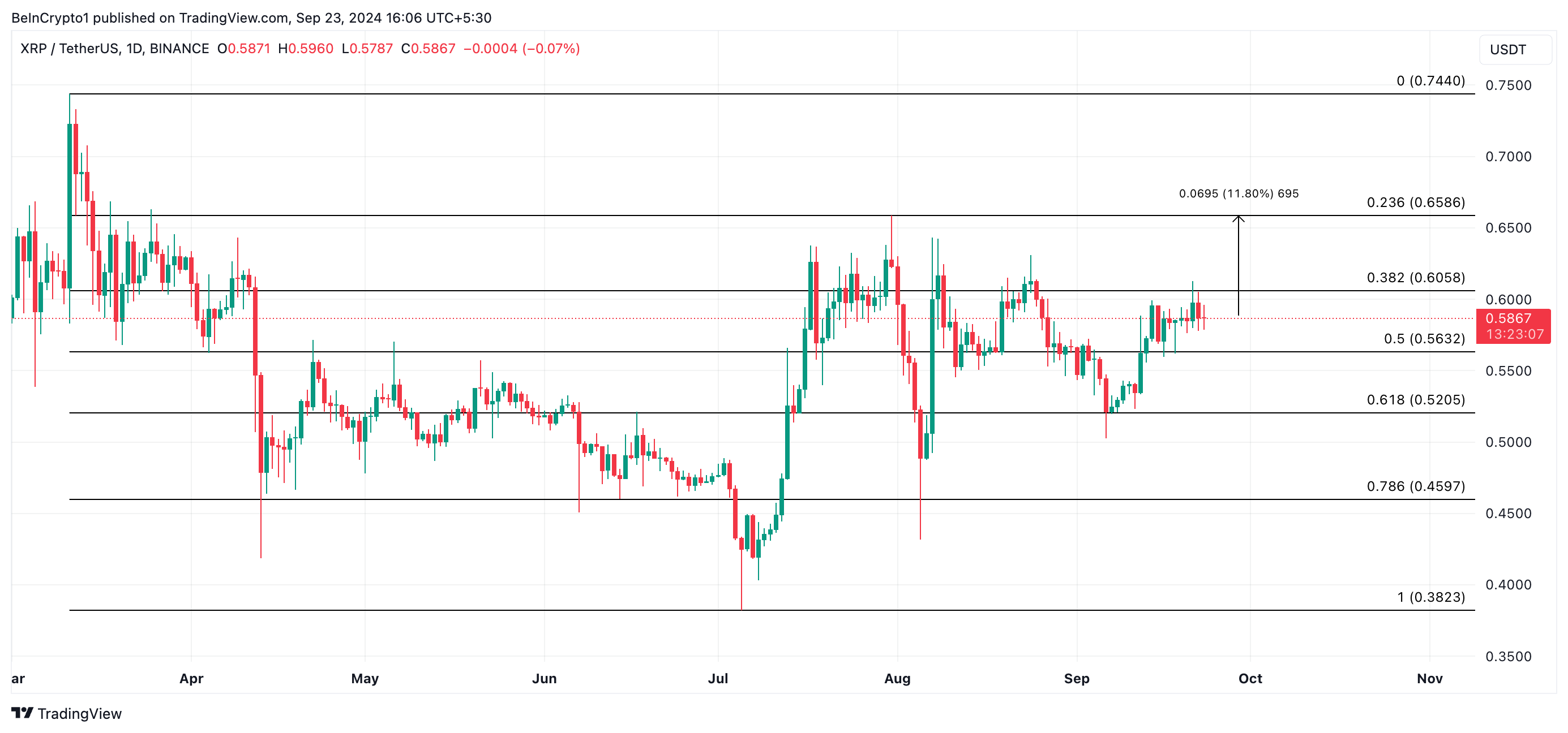 Se la pressione d’acquisto continua, il prezzo di XRP potrebbe aumentare del 12%, raggiungendo 0,65 USD, un livello visto l’ultima volta il 1 agosto. Una rottura sopra 0,65 USD potrebbe spingere il prezzo a 0,74 USD, segnando un massimo di sei mesi.