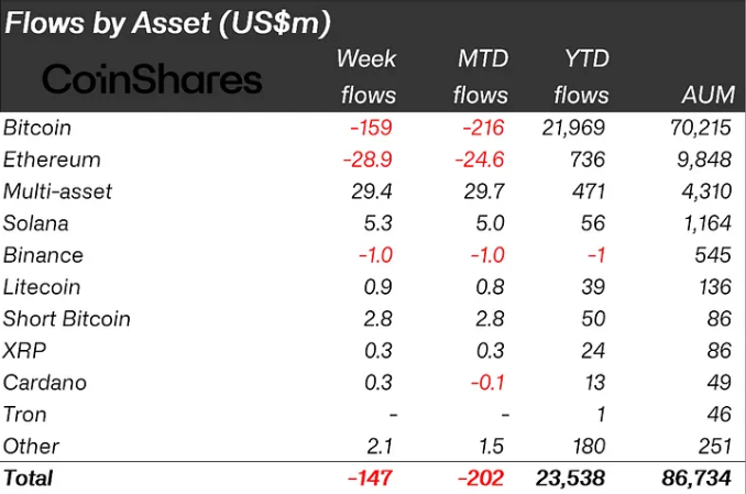 L’ultimo rapporto di CoinShares mostra che i deflussi degli investimenti in asset digitali hanno raggiunto 147 milioni USD la scorsa settimana. Bitcoin è stato al centro dei deflussi, con 159 milioni USD in uscita. Anche Ethereum (ETH) ha registrato deflussi di 28,9 milioni USD.