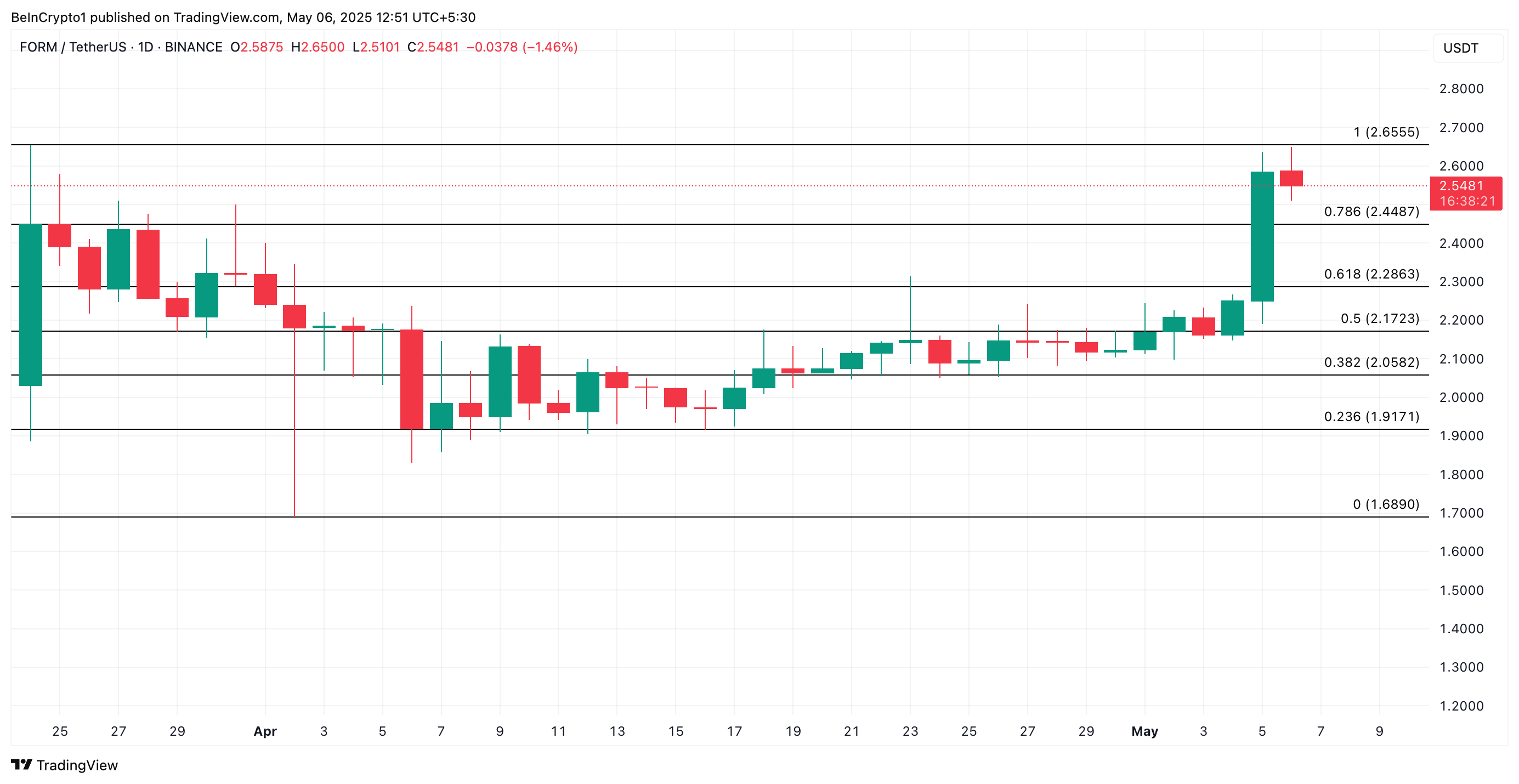 FORM attualmente viene scambiato a $2,54, appena il 4% al di sotto del suo massimo storico di $2,65, che forma una resistenza al di sopra del suo prezzo. Se il sentimento rialzista verso l’altcoin aumenta, potrebbe riconquistare questo picco di prezzo e tentare di superarlo per registrare nuovi massimi.