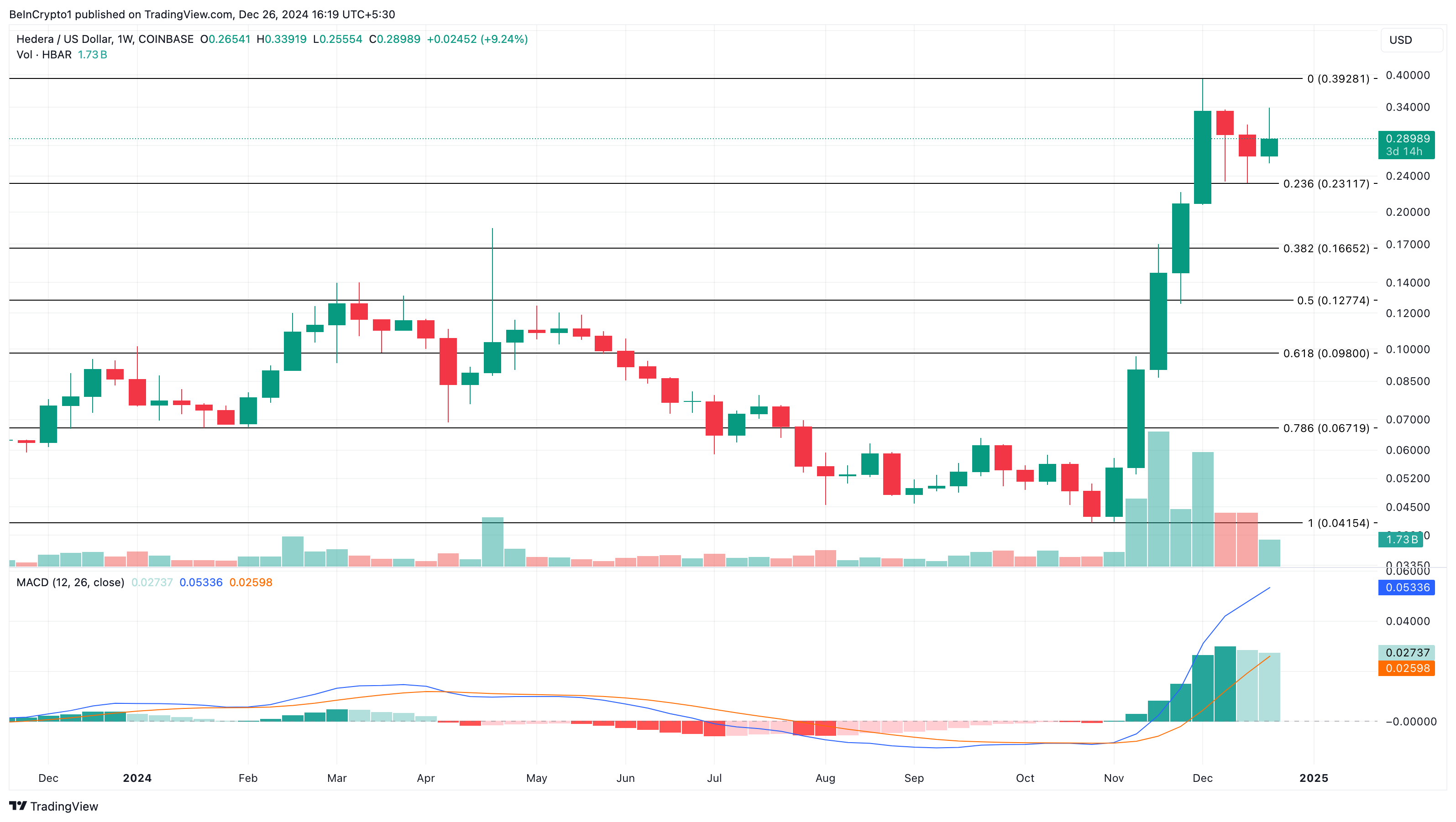 Secondo il grafico settimanale HBAR/USD, il Moving Average Convergence Divergence (MACD) è in territorio positivo. Il MACD è un indicatore tecnico che misura il momentum utilizzando la relazione tra la Media Mobile Esponenziale (EMA) a 12 e 26 periodi.
