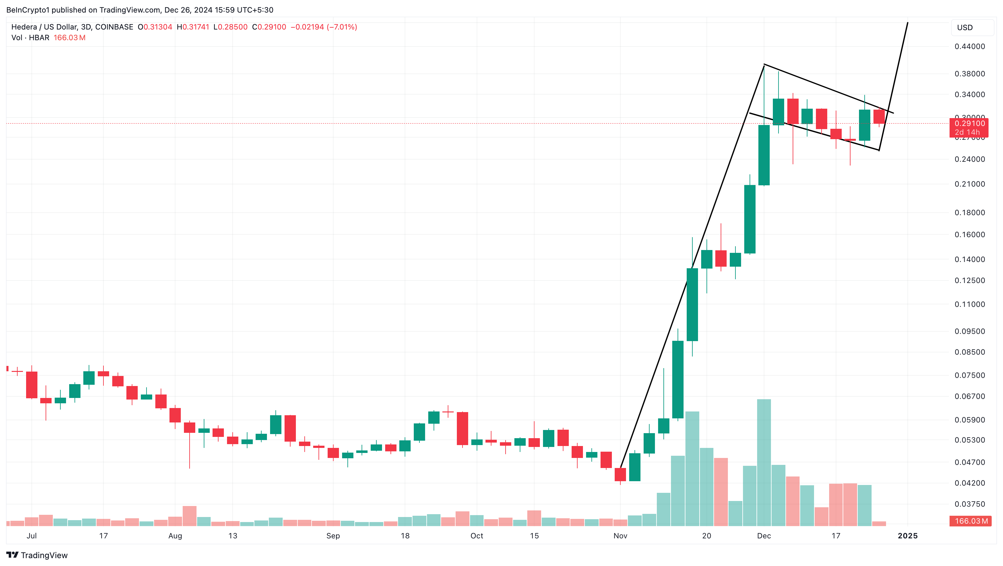 Tuttavia, l’azione del prezzo di HBAR sul timeframe di 3 giorni mostra che ha formato un bull flag. Il pattern del bull flag assomiglia a una bandiera su un’asta ed è considerato un pattern rialzista. Si forma tipicamente dopo un forte movimento di prezzo verso l’alto, seguito da una breve fase di consolidamento o ritracciamento.