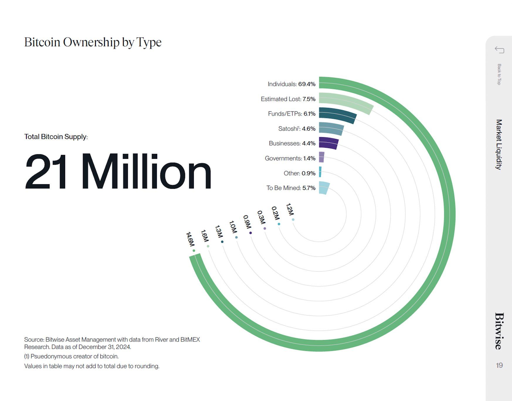 Secondo Bitwise Asset Management, i detentori individuali controllano la maggior parte della fornitura totale di Bitcoin (BTC). Il 69,4% dei 21 milioni di BTC in circolazione appartiene a investitori privati.