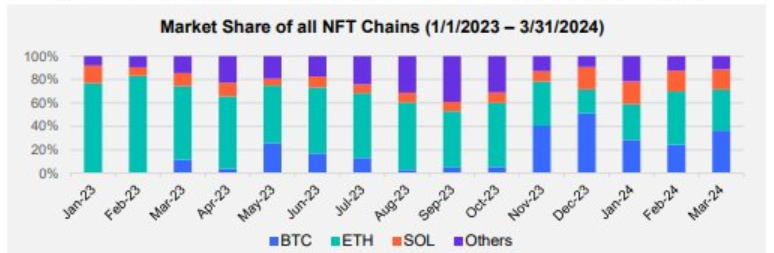 L’analisi di mercato della società mostra che gli NFT basati su Bitcoin hanno superato le loro controparti Ethereum in termini di crescita più volte dal novembre 2023. Un dato significativo di questa analisi è il rendimento degli Ordinals Bitcoin, che si sono assicurati una quota di mercato del 50% circa nel dicembre 2023.