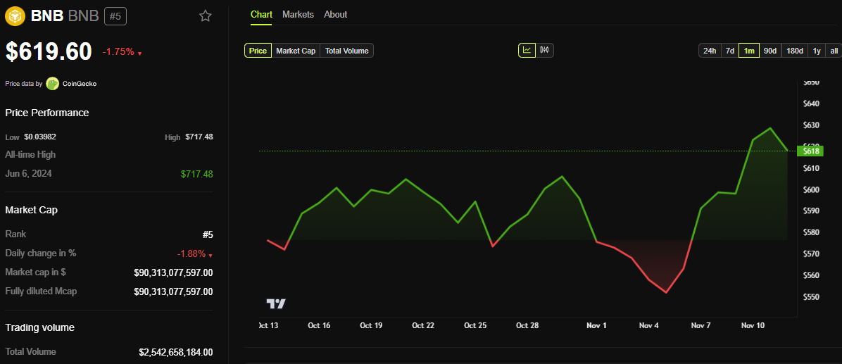 Il Binance Coin (BNB) è sceso di quasi il 2% con questa notizia. È quotato a 619,60 USD al momento di questa scrittura.