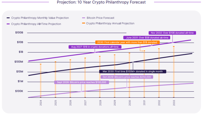 The Giving Block prevede che le donazioni in criptovaluta raggiungeranno il livello di 1 miliardo di dollari entro il 2027. Prevede inoltre che oltre 10 miliardi di dollari saranno donati in cripto entro la fine del 2032.
