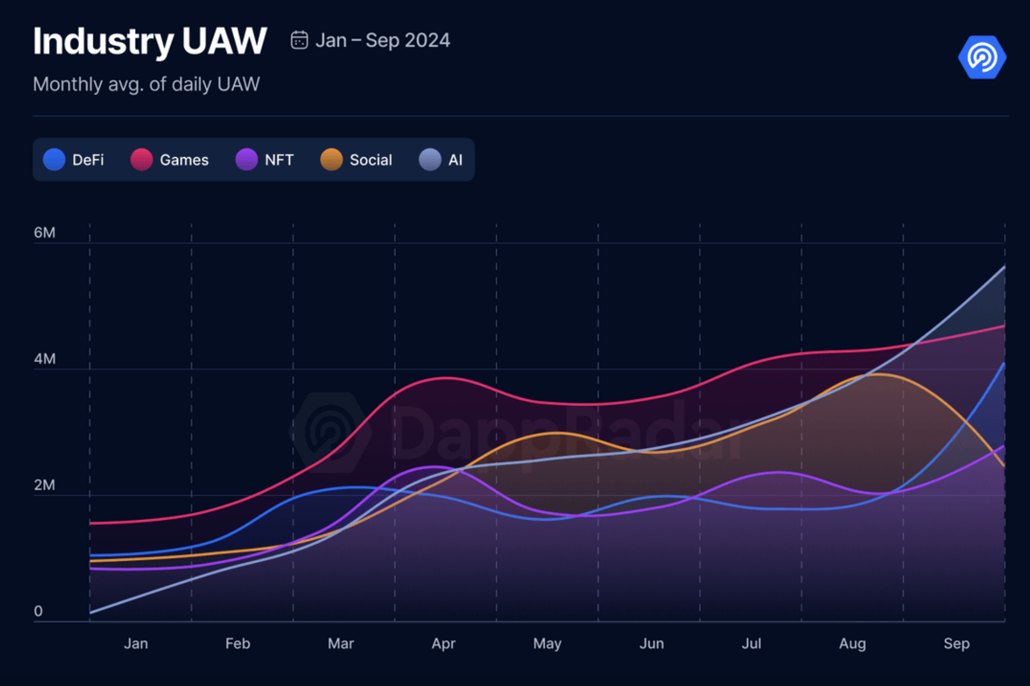 Secondo un rapporto di DappRadar, il gaming su blockchain ha raggiunto un massimo di 7,4 milioni di Unique Active Wallets giornalieri (dUAW) entro la fine del 2024, rappresentando un aumento del 421% rispetto ai 12 mesi precedenti.