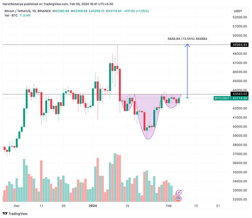 Le potenziali implicazioni di mercato di questa massiccia vendita di Bitcoin sono profonde. Gli analisti stanno monitorando attentamente i movimenti di prezzo del Bitcoin. Tuttavia, da un punto di vista tecnico, sul grafico giornaliero si è formato un possibile modello di testa e spalle inverso, con la scollatura situata approssimativamente a 43.500 dollari.