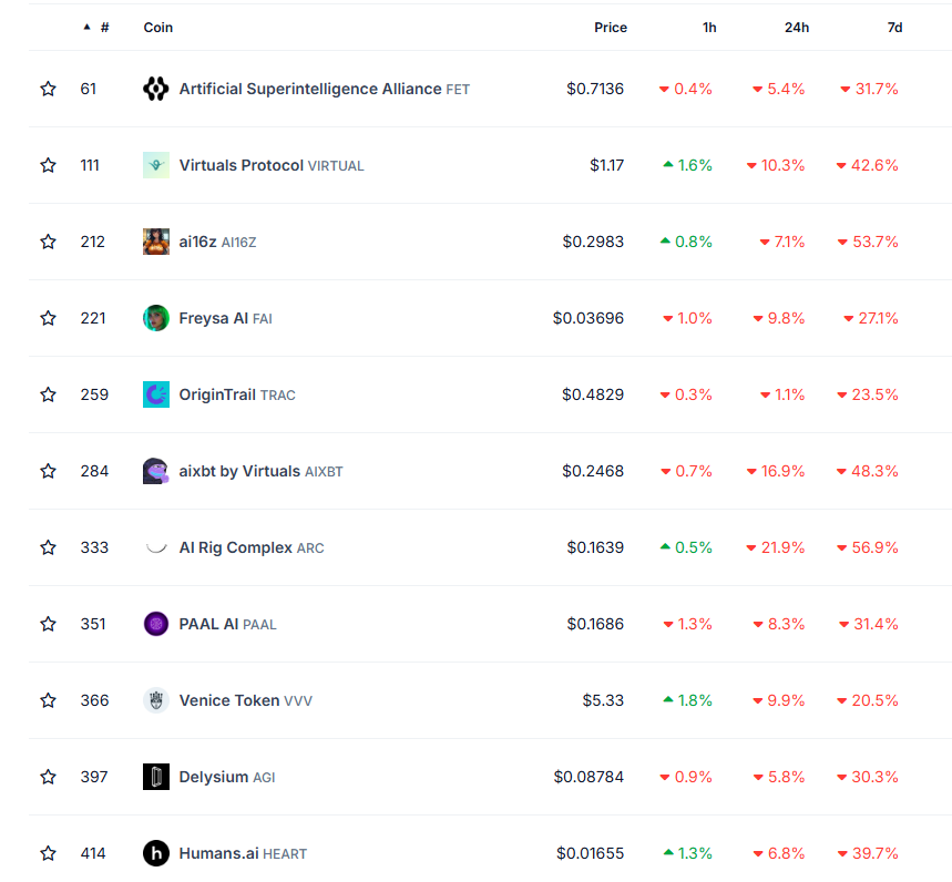 Tutte le prime 10 criptovalute agenti AI crypto hanno registrato perdite negli ultimi sette giorni, con FARTCOIN in calo del 61%, AI16Z in calo del 59% e la più grande, VIRTUAL, che ha perso il 40% del suo valore.