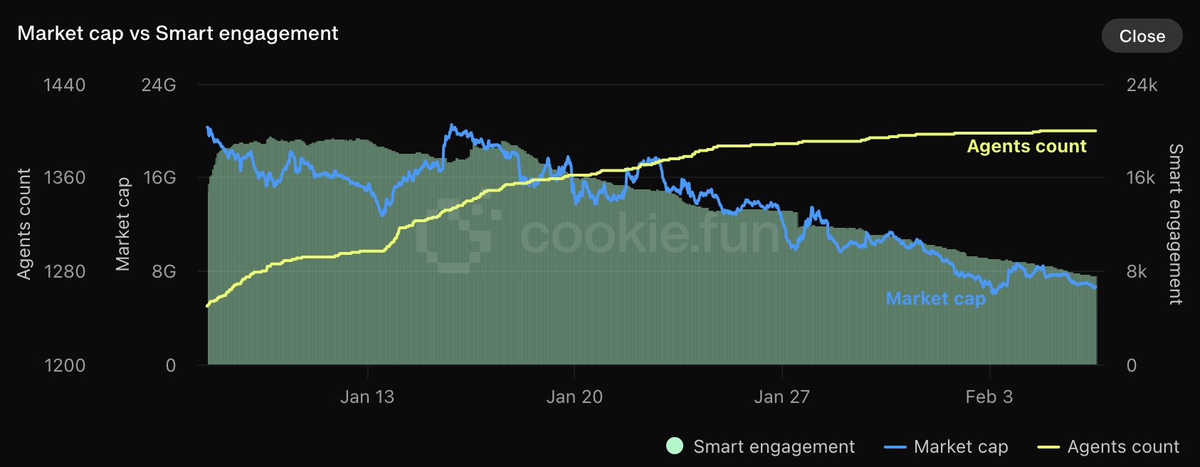 Allo stesso tempo, il coinvolgimento all’interno dell’ecosistema è diminuito drasticamente, con il numero di account intelligenti che interagiscono con questi progetti sceso da 19.069 il 17 gennaio a soli 7.541 ora – un calo impressionante del 60%.