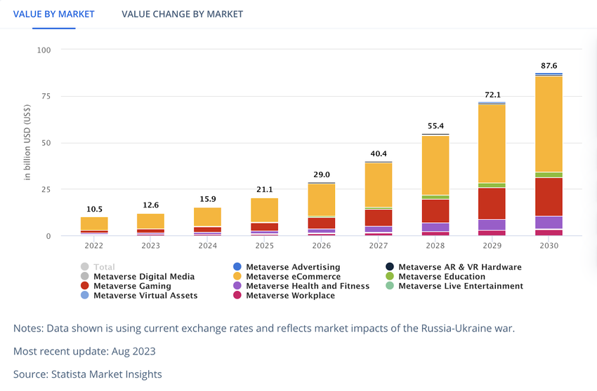 Secondo Statista, il settore dei metaversi crescerà di almeno sette volte entro il 2030. Quest’anno il settore ha un valore di 12,6 miliardi di dollari e si prevede che nei prossimi sette anni raggiungerà una valutazione di 87,6 miliardi di dollari.