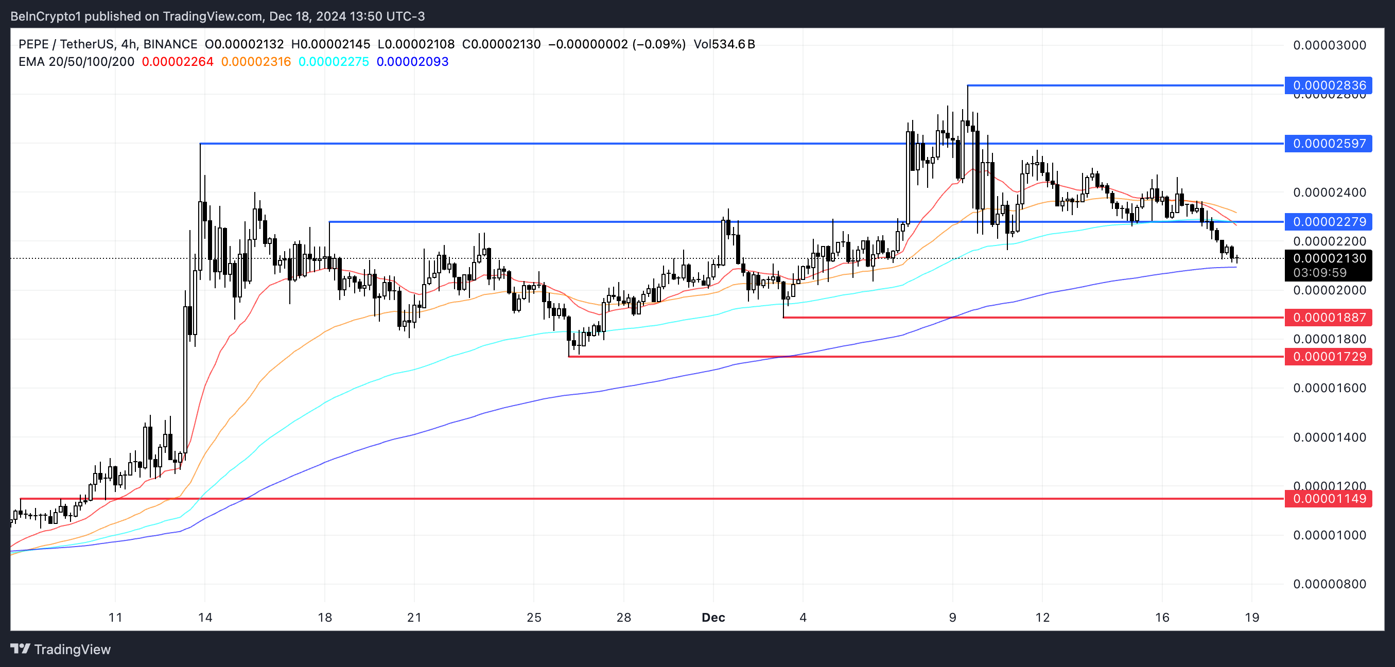 Il supporto a 0.0000188 USD è un livello critico per il prezzo di PEPE, poiché una rottura al di sotto potrebbe portare a ulteriori cali. Se questo supporto fallisce, PEPE potrebbe testare 0.000017 USD, con il potenziale di scendere fino a 0.000011 USD, rappresentando una correzione del 47% dai livelli attuali.