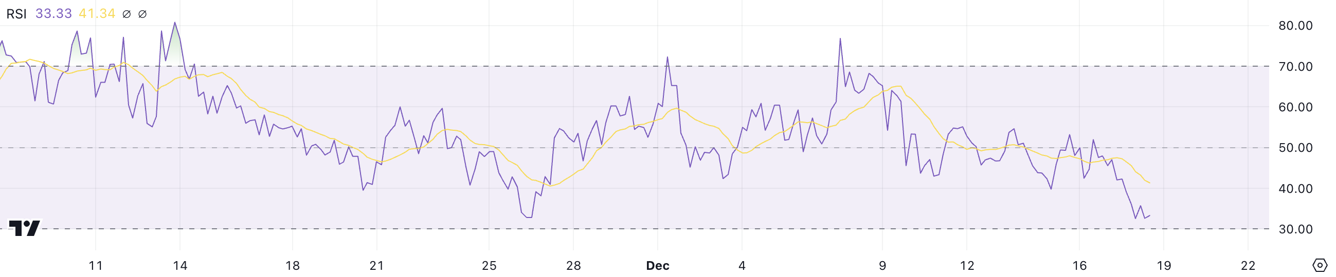 PEPE RSI è attualmente a 33.3, riflettendo un forte calo dal 16 dicembre. Questo indica che il memecoin si sta avvicinando al territorio di ipervenduto, poiché il suo RSI si avvicina alla soglia critica di 30.