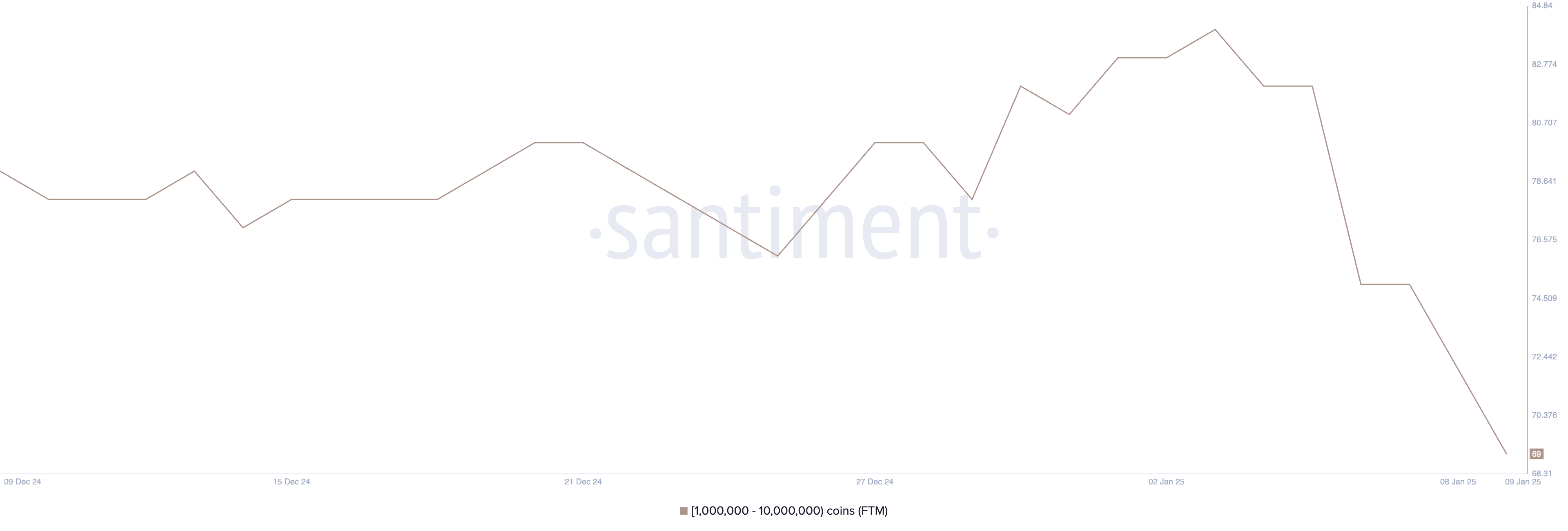 Il numero di wallet che detengono tra 1 milione e 10 milioni di FTM è diminuito significativamente, scendendo a 69 da un massimo mensile di 84 il 3 gennaio. Monitorare il comportamento di queste cosiddette whales è cruciale, poiché le loro grandi partecipazioni spesso influenzano il sentiment del mercato e la liquidità.