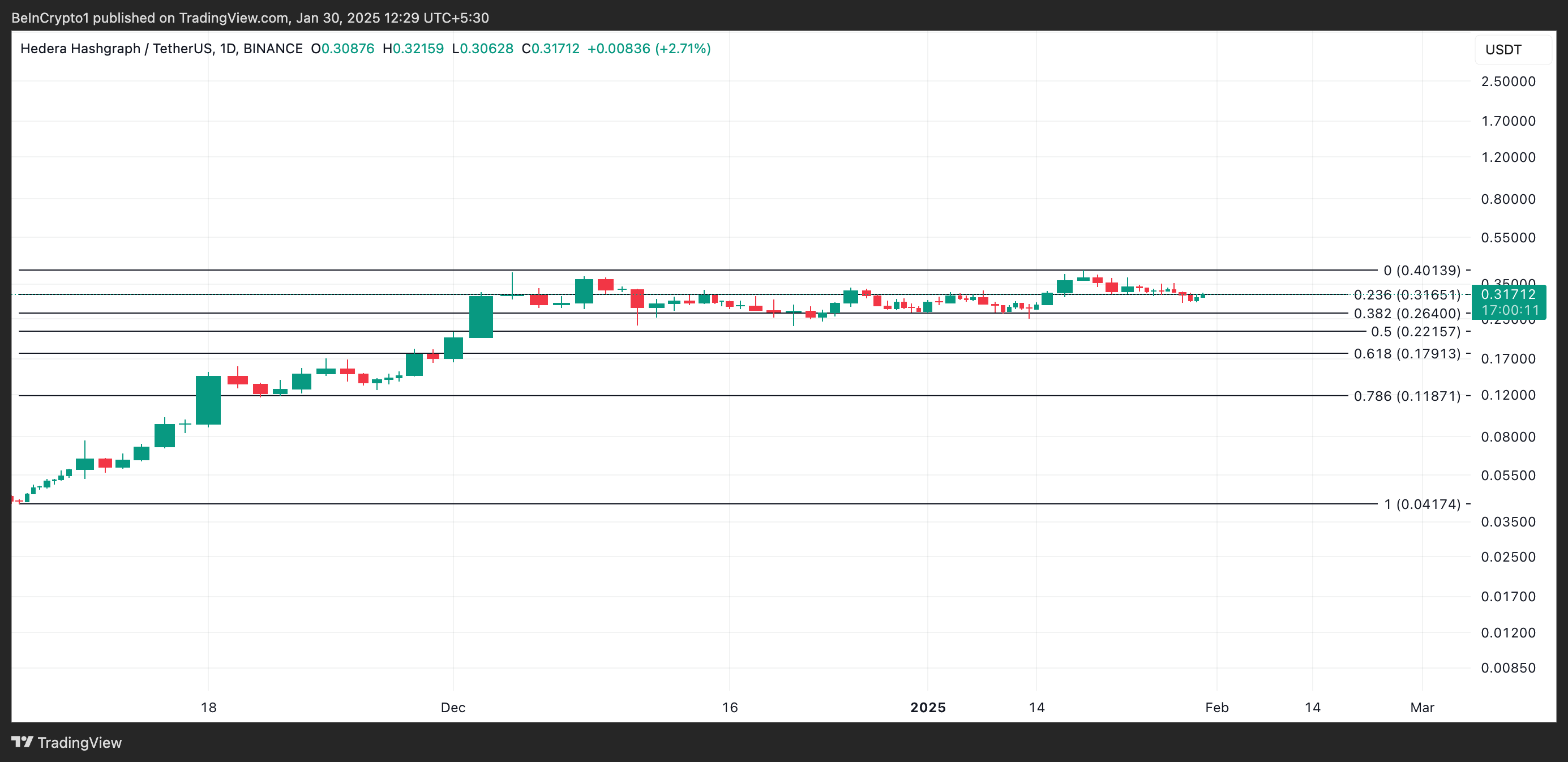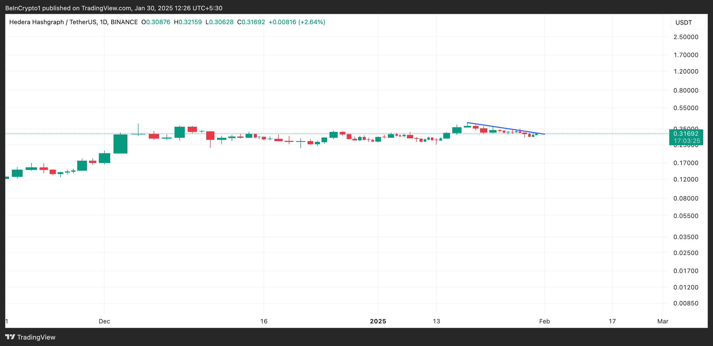 La valutazione di BeInCrypto della performance del prezzo di HBAR su un grafico giornaliero rivela che l’altcoin ha scambiato sotto una linea di tendenza discendente dal 17 gennaio. Il token scambia a 0.31 USD al momento della stampa, notando un calo del prezzo del 20% da allora.