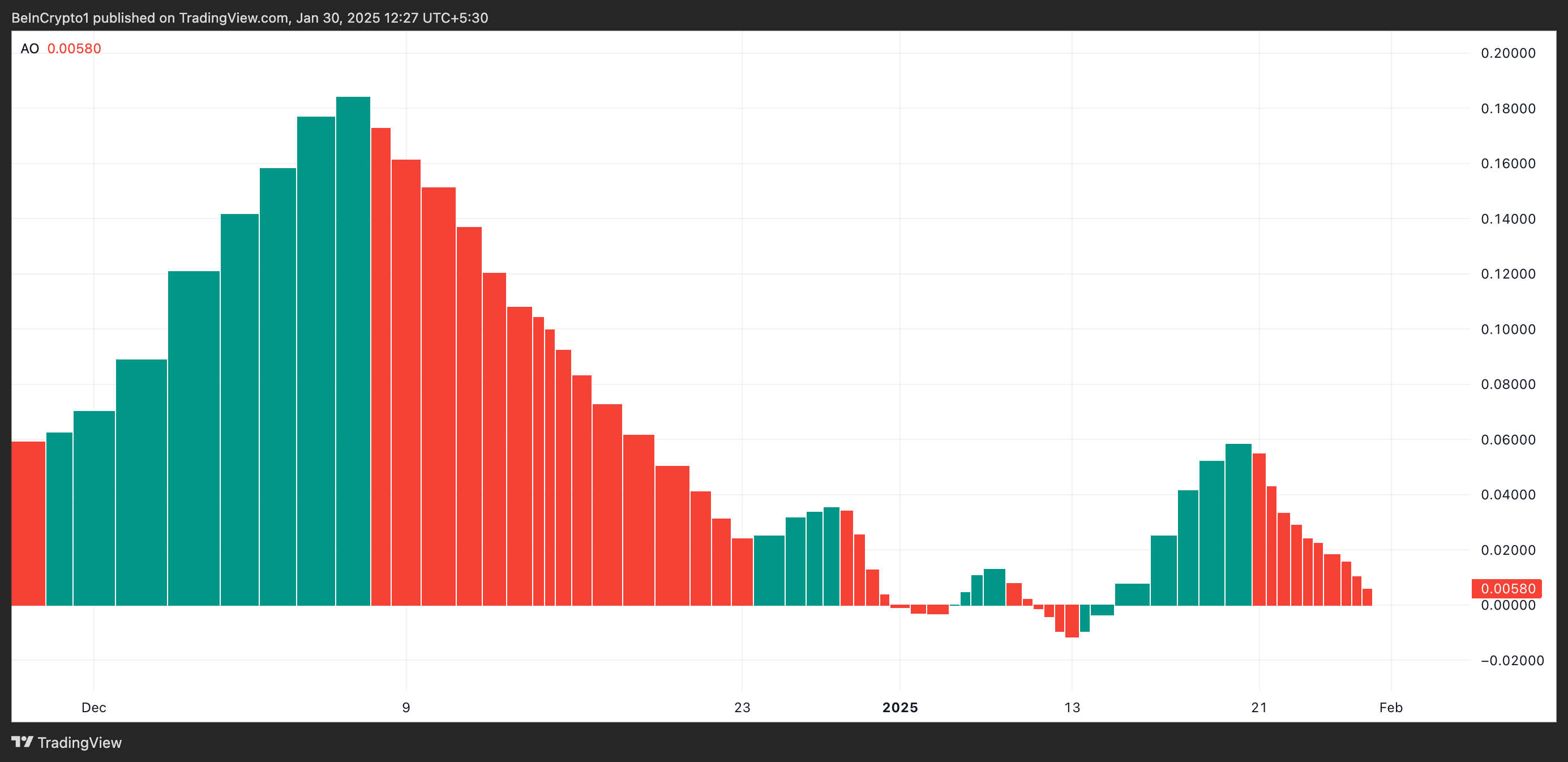 L’AO di un asset misura il momentum del mercato confrontando la differenza tra due medie mobili semplici (SMA) del prezzo di un asset. Quando le sue barre sono rosse, indica un cambiamento verso un momentum ribassista, suggerendo che i venditori stanno guadagnando forza e il mercato potrebbe essere pronto per ulteriori ribassi.