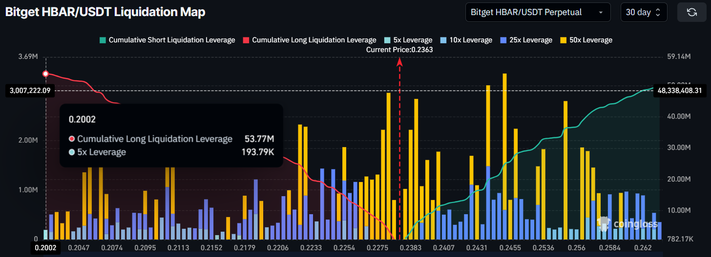 Guardando la mappa delle liquidazioni, c’è una reale possibilità di perdite significative per i trader di HBAR. La mappa mostra che se il prezzo scende a $0,20 o meno, circa 53 milioni di dollari in posizioni long verrebbero liquidati. Questo creerebbe un’ondata di pressione di vendita e potrebbe potenzialmente far scendere ulteriormente il prezzo.
