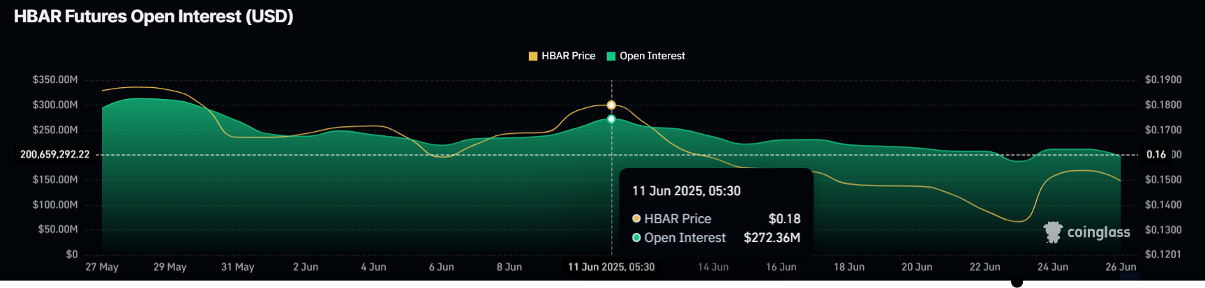 Nelle ultime due settimane, l’Open Interest (OI) di HBAR è diminuito di quasi $80 milioni, segnalando un crescente scetticismo tra i trader. Inizialmente innescato dal forte calo del prezzo dell’altcoin, il calo dell’OI è continuato anche questa settimana. L’OI è sceso da $272 milioni a $194 milioni, suggerendo che i trader stanno ritirando i loro fondi da HBAR a causa dell’incertezza persistente nel mercato.