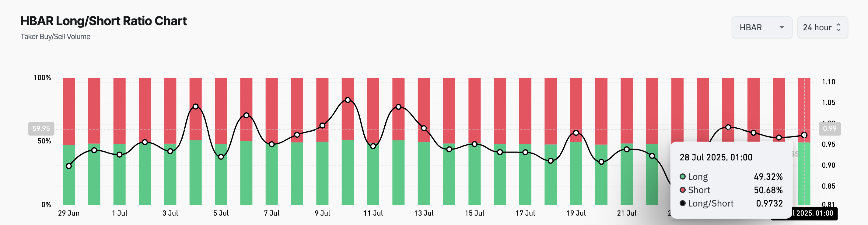 Questo schema è generalmente interpretato come un segnale ribassista, specialmente se un calo del rapporto long/short accompagna l’aumento dell’open interest. Questo è il caso di HBAR, aggiungendo pressione ribassista sull’altcoin. Al momento della scrittura, il rapporto è di 0,97.