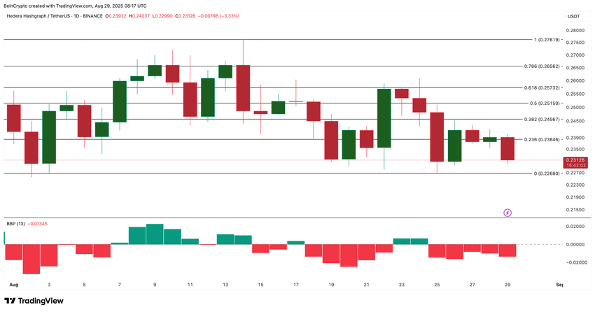 Al momento della pubblicazione, il prezzo di HBAR è scambiato intorno a $0,231. Perdere $0,23, e la prossima discesa verso $0,22 diventa probabile, ancor di più con l’indicatore Bull-Bear Power (BBP) che si sposta fortemente nella zona negativa.
