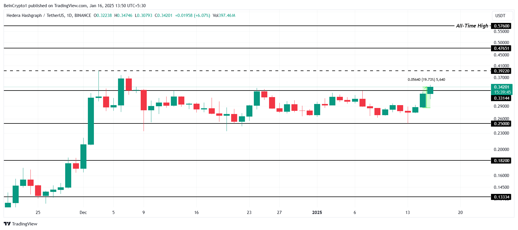 HBAR ha finalmente rotto la sua consolidazione di un mese sotto 0,33 USD, un livello che ha visto diversi tentativi di breakout falliti.