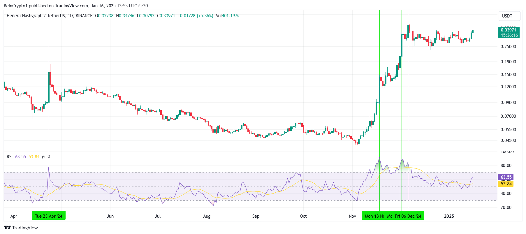HBAR è aumentato di quasi il 20% nelle ultime 24 ore, rompendo il suo range di consolidamento tra 0,25 USD e 0,33 USD. Questo breakout segna un traguardo significativo per l’altcoin, potenzialmente preparando il terreno per ulteriori guadagni.